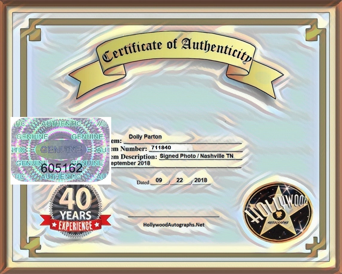 Every autograph we sell comes with our dual authentication system of an individually numbered hologram attached to the item and accompanied by a watermark paper certificate document with holographic matching numbers.